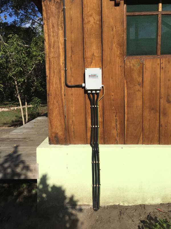 For the off-grid power supply of the headquarters of a Mozambican national park (Reserva Nacional do Gilé), a QuattroPower AC24048T was implemented as Microgrid by our local partner SwissSolar. Four guest houses, a restaurant and staff accommodation of the facility are powered by a 3-phase system with up to 24kVA. The three solar generators with a total output of 12.6 kWp together with a 60kWh OPzV lead-acid battery from Hoppecke ensure the power supply. The solar generators were mounted on a wooden structure at a height of approx. 3 m and so serve as a shelter at the same time.